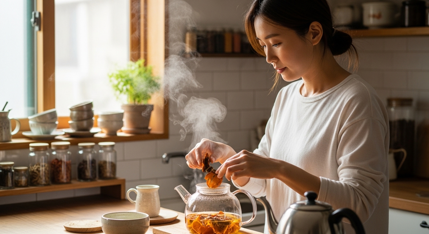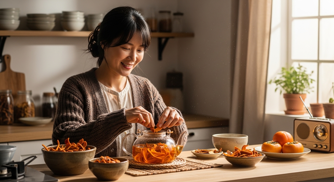 햇볕에 잘 말린 감껍질을 살짝 볶아 우려 마시면, 은근한 단맛과 향이 매력적입니다.
