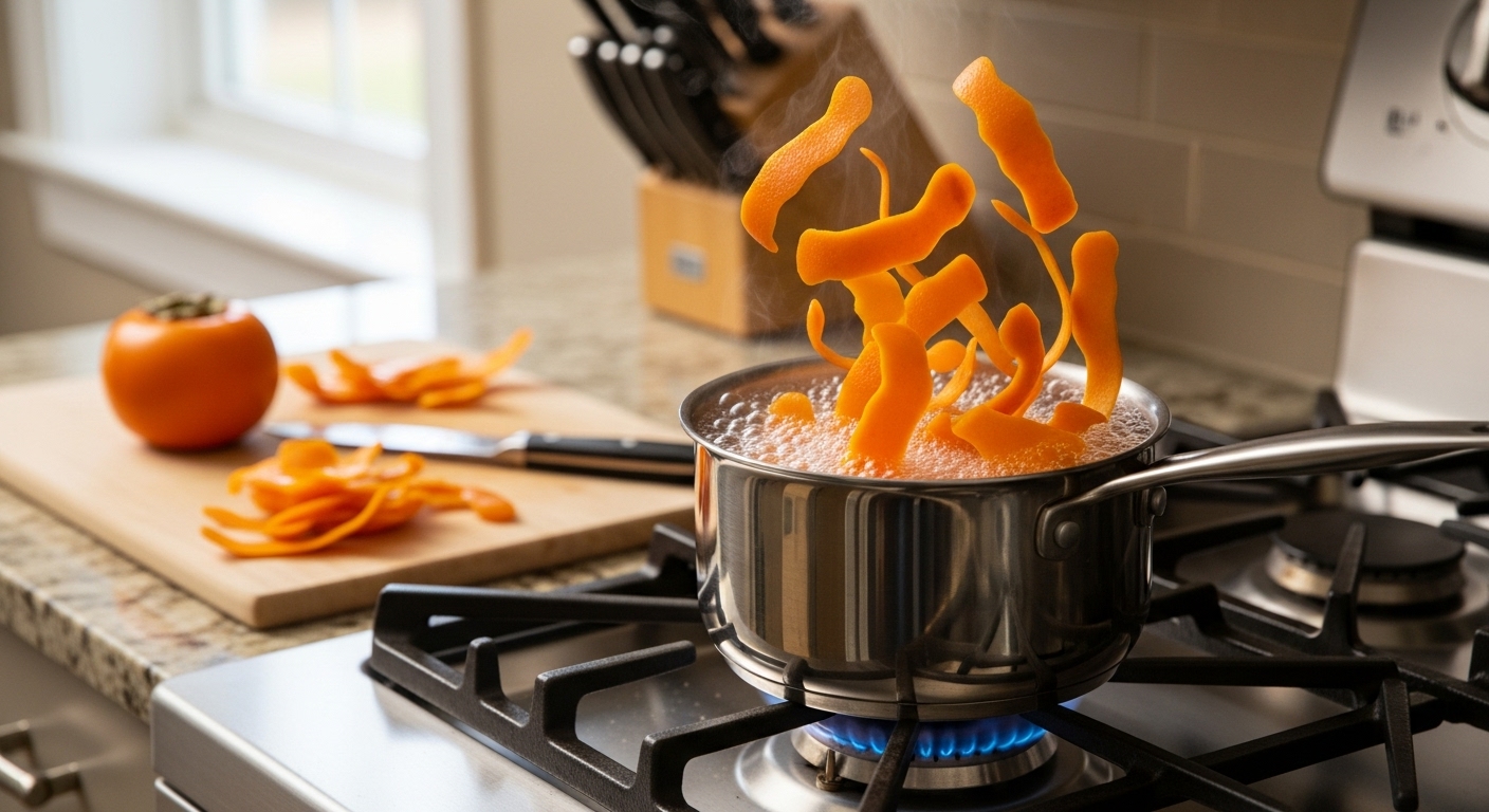 물에 감껍질을 넣고 끓여서 주방 악취 제거에 사용하면, 천연 세정 효과도 기대할 수 있습니다.