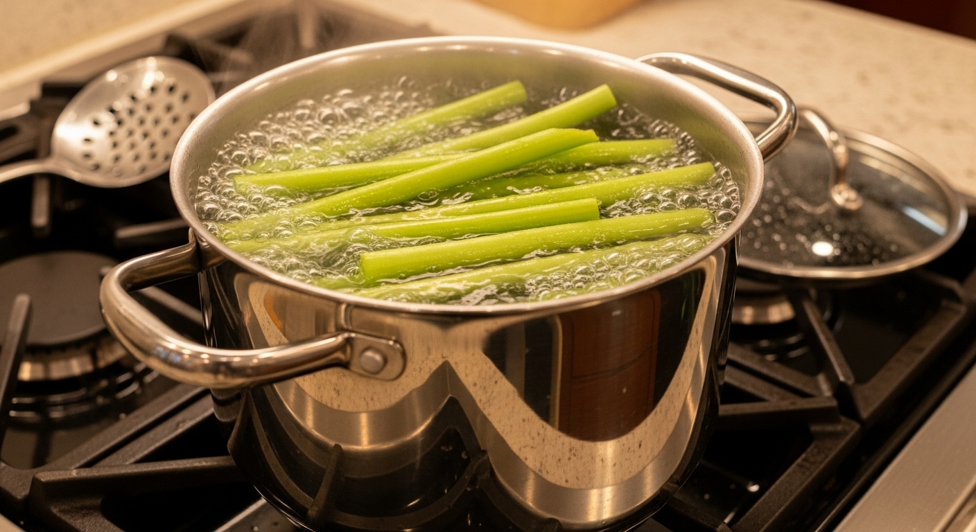- 데친 뒤 얼음물에 헹구면 줄기의 색감이 선명해지고 아삭한 식감이 유지됩니다.