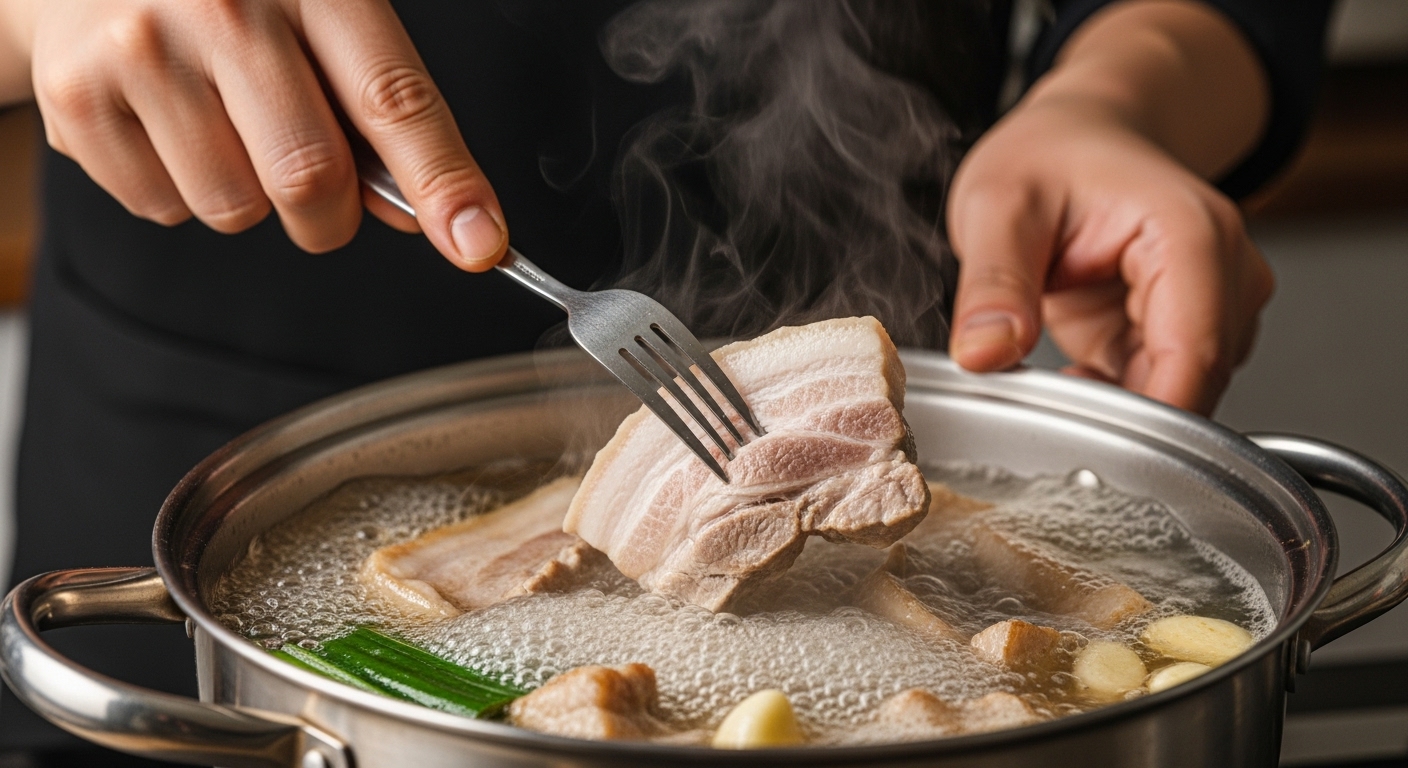Q1. 돼지수육 삶을 때 반드시 초벌 데치기를 해야 하나요?