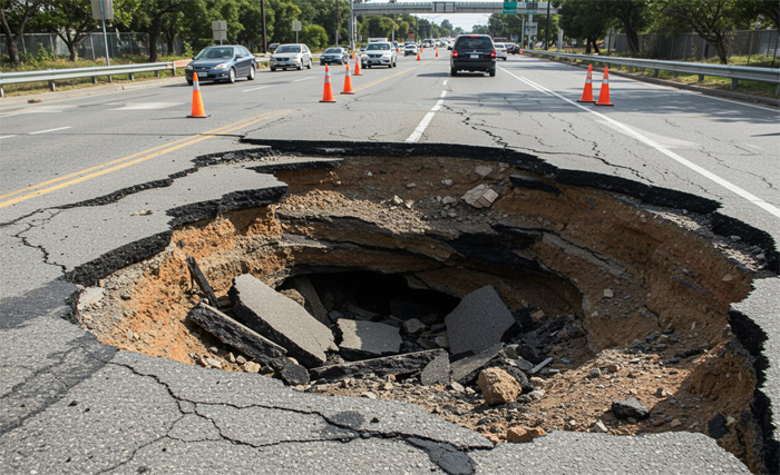 인위적 요인으로는 먼저 지하철 공사나 터널 공사, 건물 기초 공사 등으로 인해 주변 지반이 약해지거나 공간이 생기면서 발생할 수 있습니다. 또한 노후된 하수도관이 파손되면서 흙이 유실되면 지하가 비게 되고 결국 도로가 붕괴될 수 있으며 차량 통행이 많거나 과도한 무게를 이기지 못해 지반이 서서히 내려앉다가 한순간에 무너지게 됩니다.