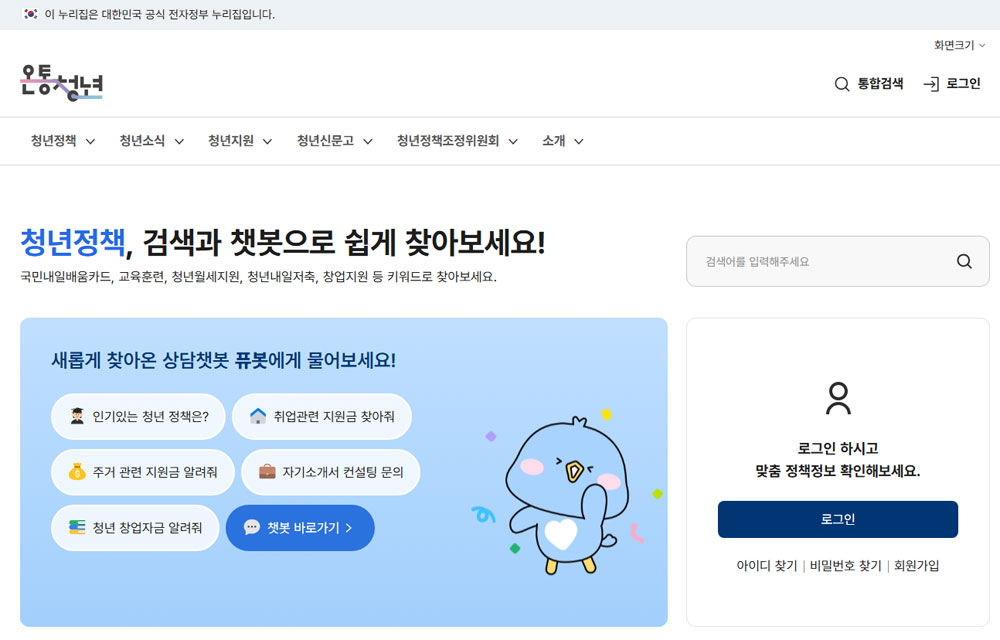 온통청년은 만 19~34세의 청년들을 위한 다양한 정책을 제공하는 사이트로 취업, 창업, 주거, 복지, 금융 지원 등 청년들이 알아야 할 정보를 한 번에 서칭 할 수 있습니다. 온통청년의 주요 기능으로는 청년 대상 취업 및 창업 지원 정책 제공, 청년 주거 및 금융 지원 정보 안내, 청년 특화 복지 및 교육 지원 프로그램 안내 등이 있습니다.