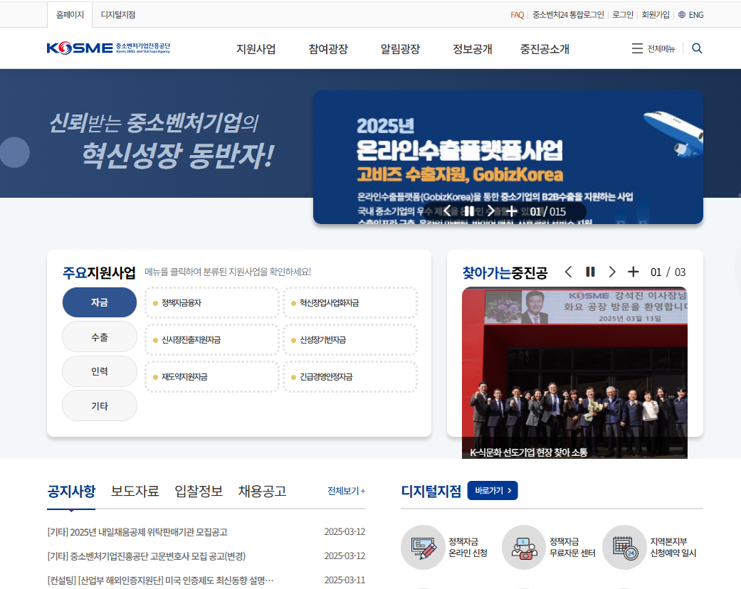 중소벤처기업진흥공단(중진공)은 중소기업 및 벤처기업을 위한 맞춤형 정책 지원 정보를 제공하는 사이트입니다. 기업을 운영하거나 창업을 준비 중이라면 정부에서 시행하는 저금리 대출 및 컨설팅, 지원 정책 등 다양한 혜택을 받을 수 있습니다. 주요 기능으로는 중소기업 대상 정책자금 및 금융 지원, 창업 및 벤처기업 지원 정보 제공, 해외 판로 개척 및 수출 지원 프로그램 운영 등이 있습니다.
