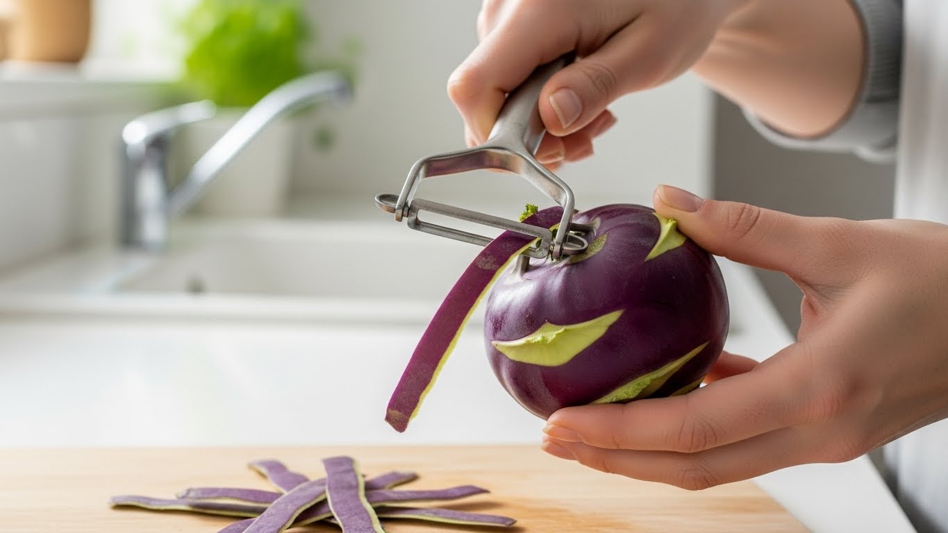 콜라비 요리를 시작하기 전 가장 중요한 단계는 기본 손질입니다. 보라색 껍질이 얇아 보여도 그대로 사용하면 질긴 식감이 남을 수 있기 때문에 손질이 필요합니다.