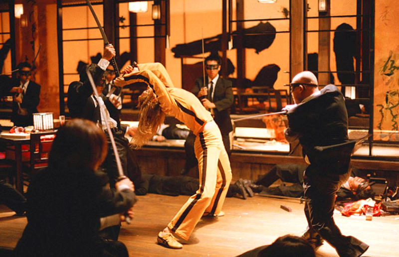 브라이드가 노란색 트레이닝복을 입고 결투하는 장면은 브루스 리의 사망유희(Game of Death, 1978)에서 영감을 받은 것입니다. 이 장면에서 브라이드는 수십 명의 적들과 맞서 싸우면서 1970년대 홍콩 액션영화의 감성을 그대로 재해석하여 연출하여 화제가 되었습니다.
